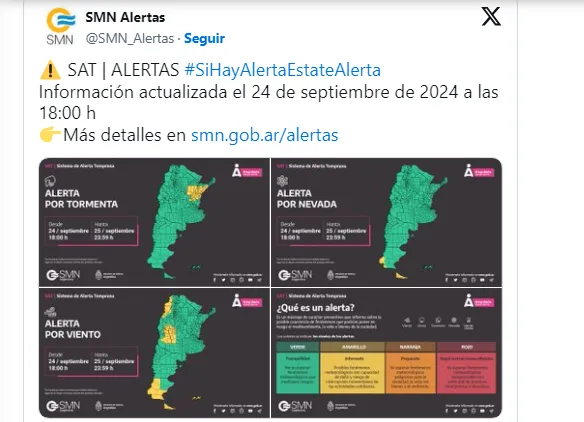 Se trata de un alerta amarillo para zonas de la cordillera de Jujuy, Salta, Catamarca y La Rioja; sur de San Juan; este de Mendoza y todo San Luis; y todo Santa Cruz y Tierra del Fuego.