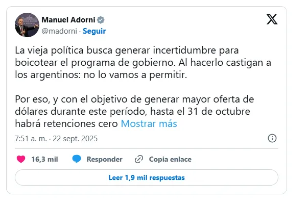 “La vieja política busca generar incertidumbre para boicotear el programa de gobierno. Al hacerlo castigan a los argentinos: no lo vamos a permitir. Por eso, y con el objetivo de generar mayor oferta de dólares durante este período, hasta el 31 de octubre habrá retenciones cero para todos los granos. Fin”, anticipó el funcionario.