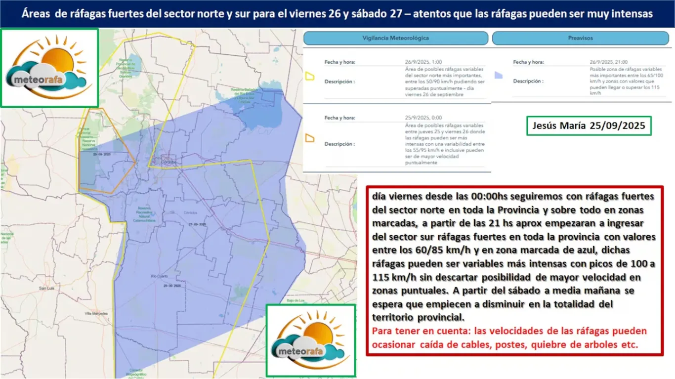 El fenómeno no pasará desapercibido: se esperan ráfagas de entre 60 y 85 km/h en gran parte de la provincia, con sectores puntuales del centro, sur, este y oeste que podrían registrar velocidades de hasta 100 o 115 km/h. Las condiciones ya comenzaron a sentirse en la tarde del jueves en el sur provincial y mantienen en alerta por el riesgo extremo de incendios.