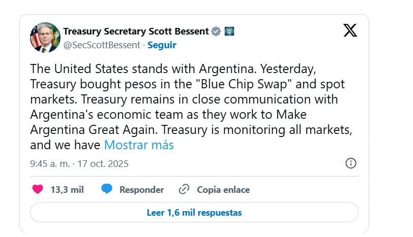 Scott Bessent señaló que "tenemos la capacidad de actuar con contundencia para estabilizar a la Argentina". El jueves, el Gobierno estadounidense volvió a intervenir en el mercado para bajar el dólar.
