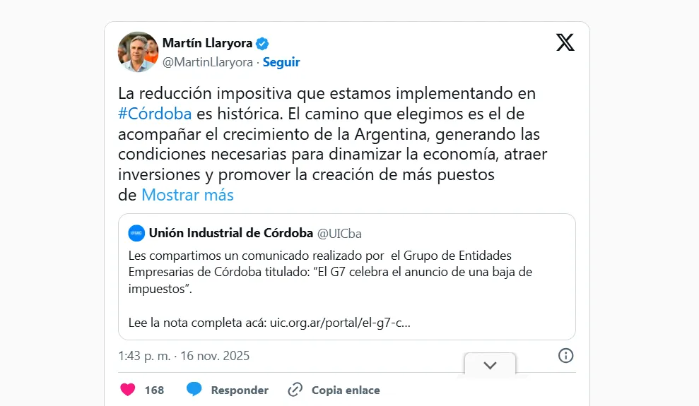 “La reducción impositiva que estamos implementando en Córdoba es histórica. El camino que elegimos es el de acompañar el crecimiento de la Argentina, generando las condiciones necesarias para dinamizar la economía, atraer inversiones y promover la creación de más puestos de trabajo en nuestra provincia”, expresó en su cuenta de X.